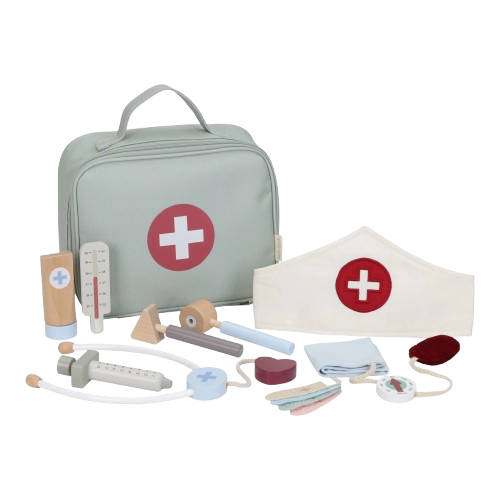 Domnule doctor, avem nevoie de tine! Cu această trusă de doctor din lemn, copiii sunt pregătiți să aibă grijă de pacienții lor. Geanta textilă elegantă conține toate instrumentele medicale esențiale: termometru, seringă, bandaje, stetoscop și tensiometru.